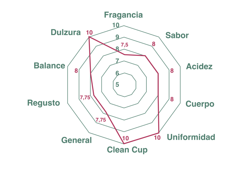 Fragancia cítrica, con aroma a naranja y limón, toques de caramelo, alta acidez cítrica, jugoso y brillante. Cuerpo medio con textura sedosa, sabor afrutado y cítrico, limpio y dulce, con una duración media. regusto. Tiene su origen en la zona de Los Santos que incluye la región de Tarrazu.